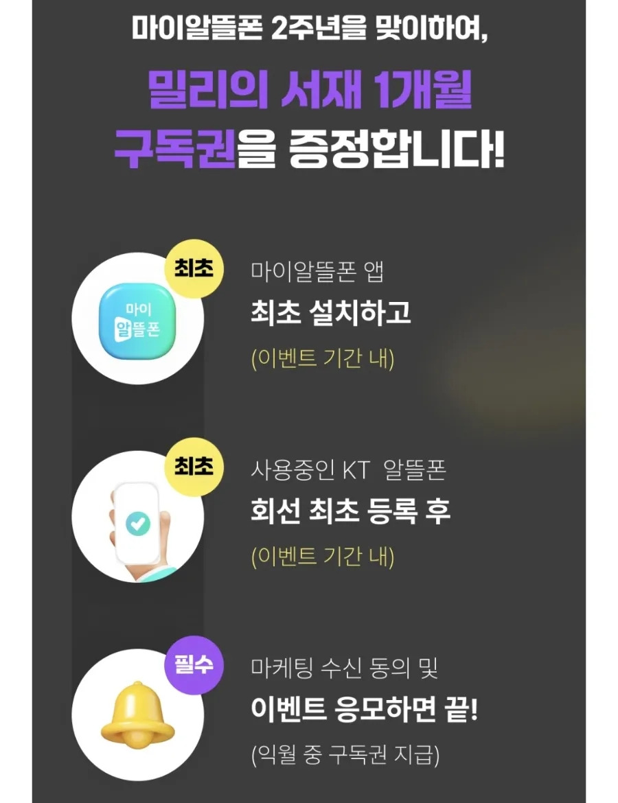 *마이알뜰폰 친구 초대 이벤트 링크로 마이 알뜰폰 회원 가입후 사용중인 kt알뜰폰 회선 등록 후 마케팅 수신동의(필수)후 이벤트 응모시 밀리의 서재 1개월 증정 사진 링크